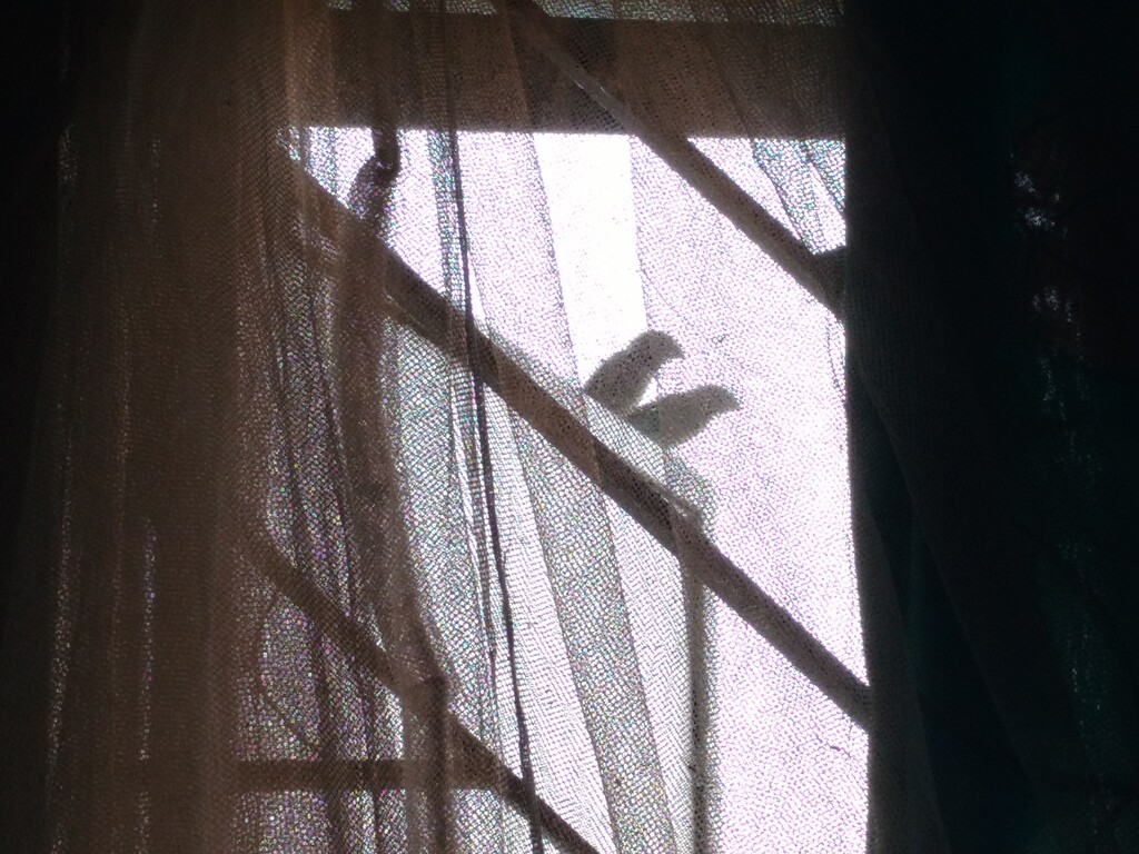 In the following days, I found the a pair of munias regularly visit my room to further build the nest. They however would leave at night. But after completing their nest, they began to say there permanently. Now I was concerned that the birds in the future could end up messing the room with droppings and with their chicks, it could cause further problems. Hence I decided to isolate the windowsill from the rest of the room. I converted my bedcover to an make shift curtain by stitching with plastic thread (no cotton thread available at hand) and placed the curtain. Also, since the curtain wasn't big enough, I stitched a mosquito net over it. But the curtain collapsed at one end leaving the nest exposed to the room. Fortunately, the birds didn't bother coming into the room - atleast most of the time. A couple of times, the birds came into my room & pooped on my bed covers and I had to chase of them off - at one instance when I chased them, they returned only after several days. I noticed a pattern and found that the birds would come into my room only at specific conditions - if it was dawn or twilight and I had my lights on. Perhaps they get confused due to the bright light source. Hence I decided to not turn on lights during those times and I didn't have a problem after that. These birds communicate in soft and pleasant calls, which isn't very noisy unlike a crow's.