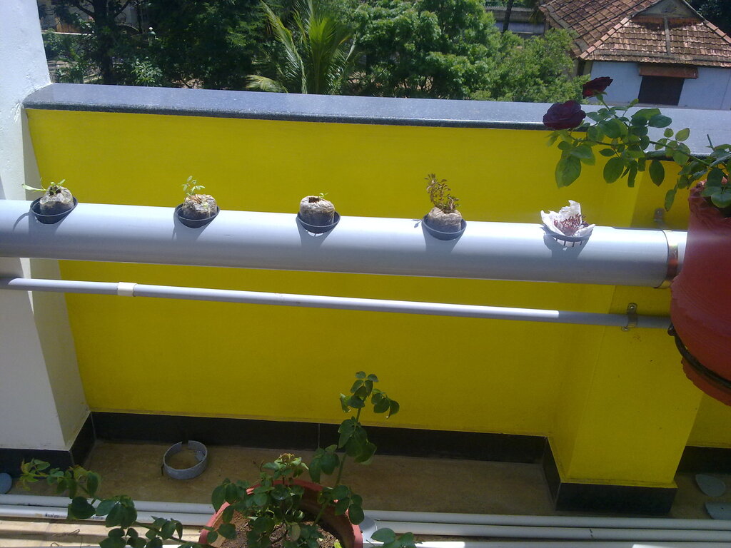 The plants were germinated in cocopeat germination plugs and placed in netpots, which were in turn placed in holes drilled in the PVC pipe. The connector in the end cap was drilled such that the water level just touched the netpots. If too much of the netpot is submerged, then roots might decay and plants die. The submersible pump present in the 50 liter nutrient reservoir tank pumped water in the big pipe, which then flowed through the pipe and drained via the smaller pipe below into the reservoir. This is a critical thing, not just for supplying nutrients, but mainly for oxygenation of water. Roots need oxygen, else they will decay and plants will die. The nutrient concentration used was 400ppm initially and when the plants grew, the concentration was increased to 800ppm. The pH of the solution was maintained between 5.5-6.5. The water/nutrient topping up is done once every week.