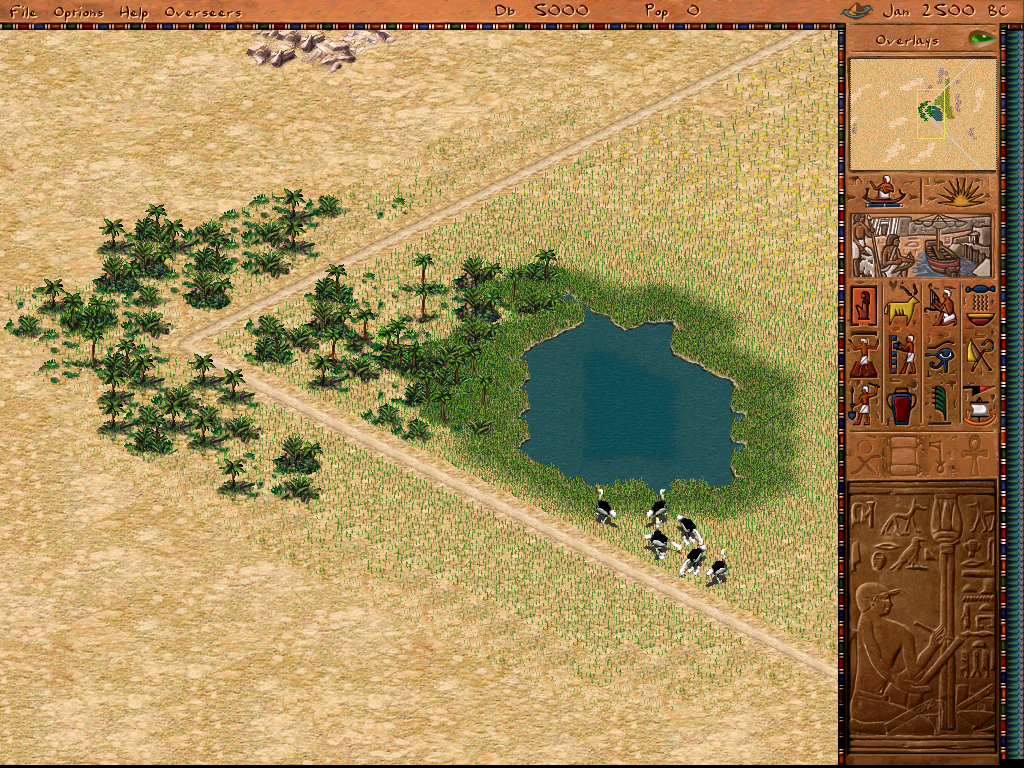 The water from the oasis is the foundation of the settlement. It is the first requirement for the settlement to grow. The game (ostriches) surrounding the water can be hunted for food and as the settlement grows, the water can be divered to fertile land to grow food crops that provide more reliable and steadier source of food. There is clay near the spring which can be dug up to make pottery and the availability of pottery makes more immigrants arrive and the settlement grows even futher. Also, it can be exported to other Egyptian cities for much needed cash (the initial funds run out soon). The pharoah periodically demands pottery, which has to be fulfilled.